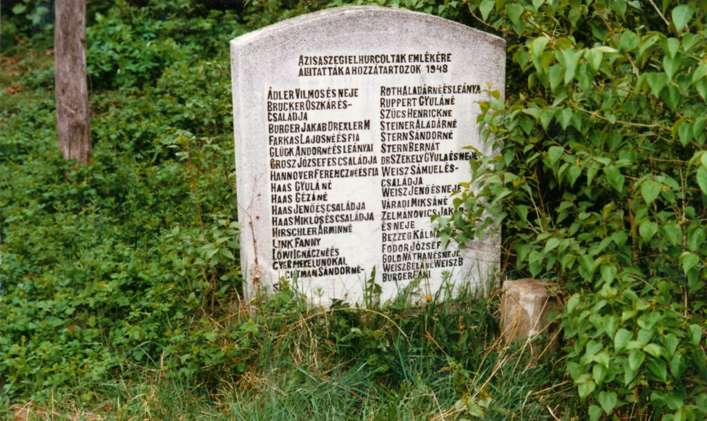 Emléktábla az elhurcolt isaszegi zsidó családok emlékére az Izraelita temetőben. Sajnos Auschwitz gázkamráiból már sohasem térhettek vissza szülőföldjükre. Állíttatták a túlélők hozzátartozói 1948-ban. Emlékezzünk rájuk mindig kegyelettel! F-254-24.
