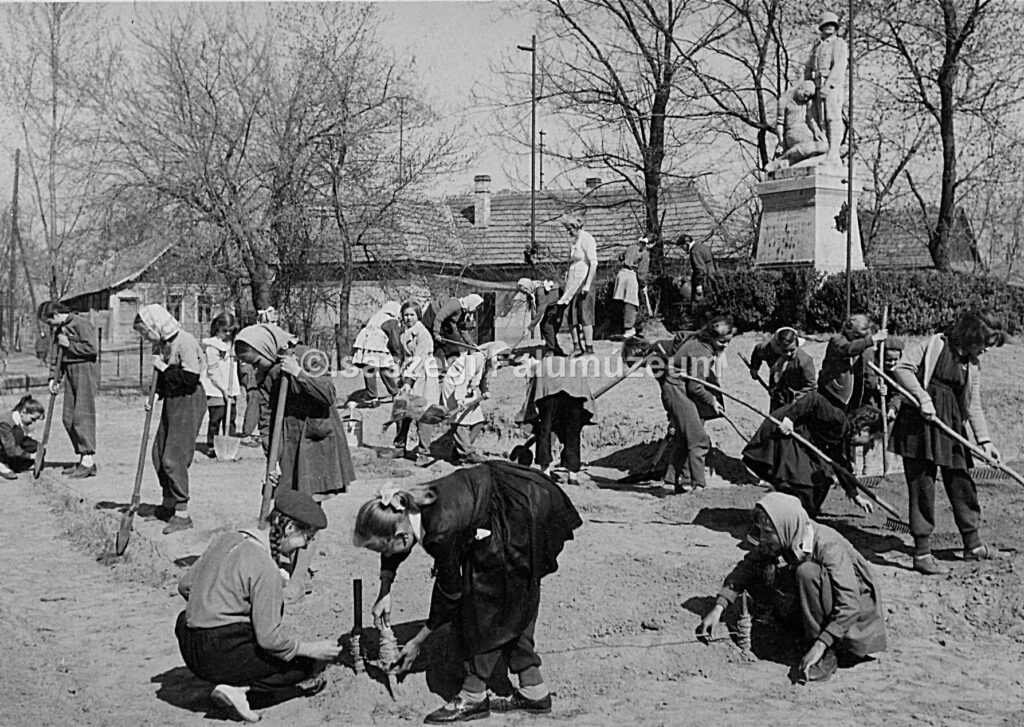 A Damjanich János Általános Iskola lánynövendékei parkosítják az I. világháborús emlékmű környezetét. Érdekes megfigyelni a lányok akkori ruházatát, többen mackó alsó nadrágban (a mai tréning v. szabadidő ruha ruha őse) vannak, fejükön vegyesen fejkendő és sapka is látható. Fotótár: 33.