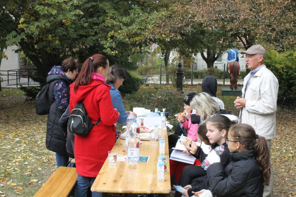 Vendégünk, kísérőnk kultúrtörténeti barangolásunk során Szabó Lajos helytörténeti kutató volt (bal oldalt). A fotó a Városháza előtt a Szent Márton kút mellet készült a lelkes „Őszifesztiválozó” diákokkal és szüleikkel. Köszönjük, hogy velünk tartottak!
