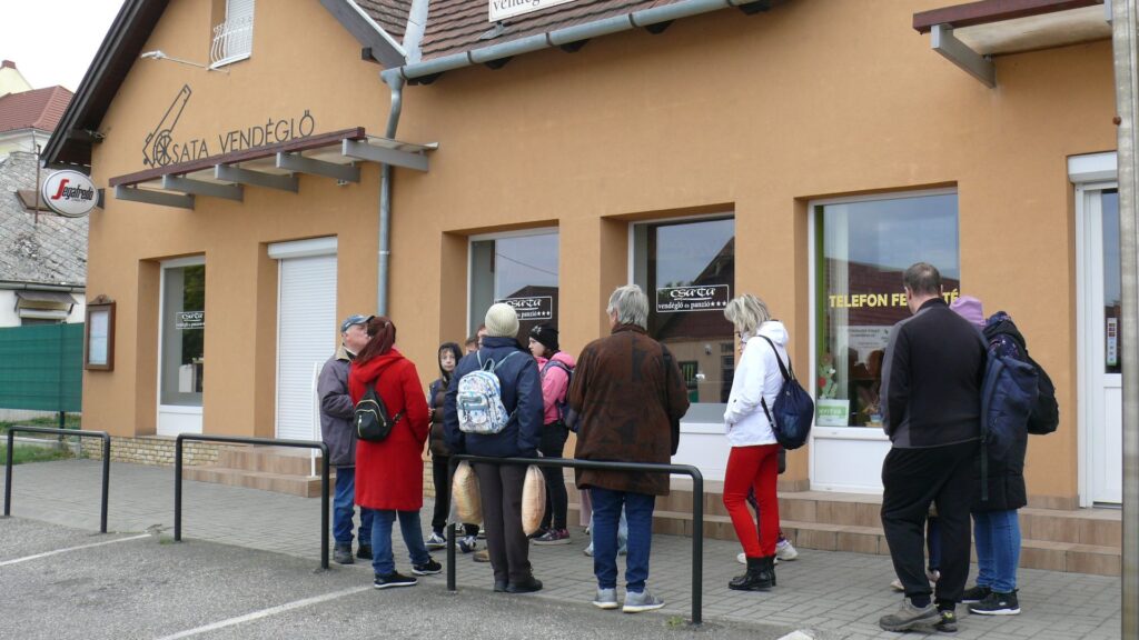 A végére maradt a legjelentősebb épület megemlítése a volt Grassalkovicok által épített egykori földesúri fogadó, később autós bisztró, majd Egon-féle kocsma, Szélkakas Vendéglő, és legvégül Csempebolt. A régi épületet elbontották, de stílusát megtartva az új Vásárcsarnokot építette fel az Önkormányzat. Ezen a kis téren bőven volt ismertetni Szabó Lajosnak és Szmolicza Józsefnek. A felmerült kérdésekre válaszoltunk, majd lassan elindultunk a Rákóczi úton. Útközben megálltunk az egykori „Angyal” Gyógyszertár épületénél, amelyet Pesthy Mihály és Thinagl Szerafin vásároltak meg Isaszegre való költözésükkor 1920-as években. Thinagl Szerafin volt az Osztrák-Magyar Monarchiában az első magyar okleveles gyógyszerésznő (1903) férjével az első gyógyszerészházaspár is. Szerafin lánya Pesthy Zsuzsanna szülei hivatását folytatta szintén gyógyszerész lett, majd férjhez ment Dr. Barabás Géza községi orvoshoz, később elváltak. Gyógyszertárukat egészen 1950-es évekig működtették az államosításig. Szerafin 1956-ban halt meg szívszélütésben Budapesten fia Pesthy István lakásán. Szerafin férje és szülei az isaszegi temetőben alusszák örök álmukat. Az Isaszegi Múzeumbarátok Köre 2025-ben a Pesthy és a Balkay család sírját újabb 25 évre megváltotta. Köszönet érte! Később Szerafinék államosított Gyógyszertárában egy darabig gyógyszertár működöt, majd a Pécel-Isaszeg Áfész Asztalos üzeme működött benne. Több éve már üresen áll az épület. Következő megállónk a volt Önki épülete előtt volt, amelyben most a Sós Perec Pékség működik. Itt említést tettünk az Önki előtt működő egykori tejpavilonról, a Városháza épületről (1904.), a homlokzatán található Wysocki-emléktábláról, a Szent Márton kútról, a kerámia képet F. Orosz Sára keramikusművész készítette (2000.). A következő megállónk a mai Csata Vendéglő épületénél volt, amelyben a II. világháború előtt Hangya Szövetkezet működött, az ’50-es évektől a Földműves Szövetkezet, majd a Pécel-Isaszeg ÁFÉSZ működtetett benne vendéglőt szintén „Csata” névvel. Sokáig a vendéglő mellett, de ugyanabban az épületben Ruházati bolt is működött. Visszaérkezve a múzeumhoz kb. 13:30 körül a kirándulás résztvevőit finom friss zsíros kenyérrel, üdítővel, és nassolni valóval vendégeltük meg. A legvégén említést tettünk még a Gyarmaty-féle vendéglőről (Rózsa u.), ahol szabályos bokszmeccset vívtak az isaszegiek a Gödöllői Gépgyár bokszolóival. Szabályos ringet alakítottak ki – Szabó Lajos úr elmondása szerint. Az Orlik kocsmát is megemlítettük (Móricz Zs. u.), de ezt az útvonalat nem jártuk be. Ugyanígy kimaradt a „Dózsa” Presszó a régi Kultúrház épületében, amely Juni-féle vendéglő volt, előtte pedig a Gergely-féle kocsma működött benne. Szabó Lajos úr és Szmolicza József igyekeztek minél több ismeretanyagot elmondani a jelenlévőknek, hogy minél többet tudjanak meg Isaszeg gazdag történelmi múltjából.
