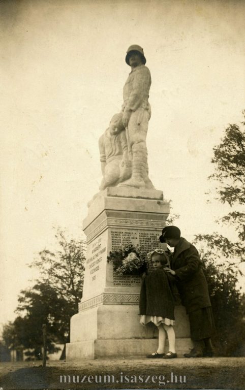 I. Világháborús emlékmű a város főterén a képen Radó Gyuláné tanítónő Évike kislányával látható, amint virágcsokrot helyeznek el az emlékműhöz. A tanítónő férje Radó Gyula 1916-ban hősi halált halt Galíciában Smolyava településen, a mai Ukrajna területén. Élt 31 évet. A császári és királyi 68. gyalogezred katonája volt. Fotótár: 585.