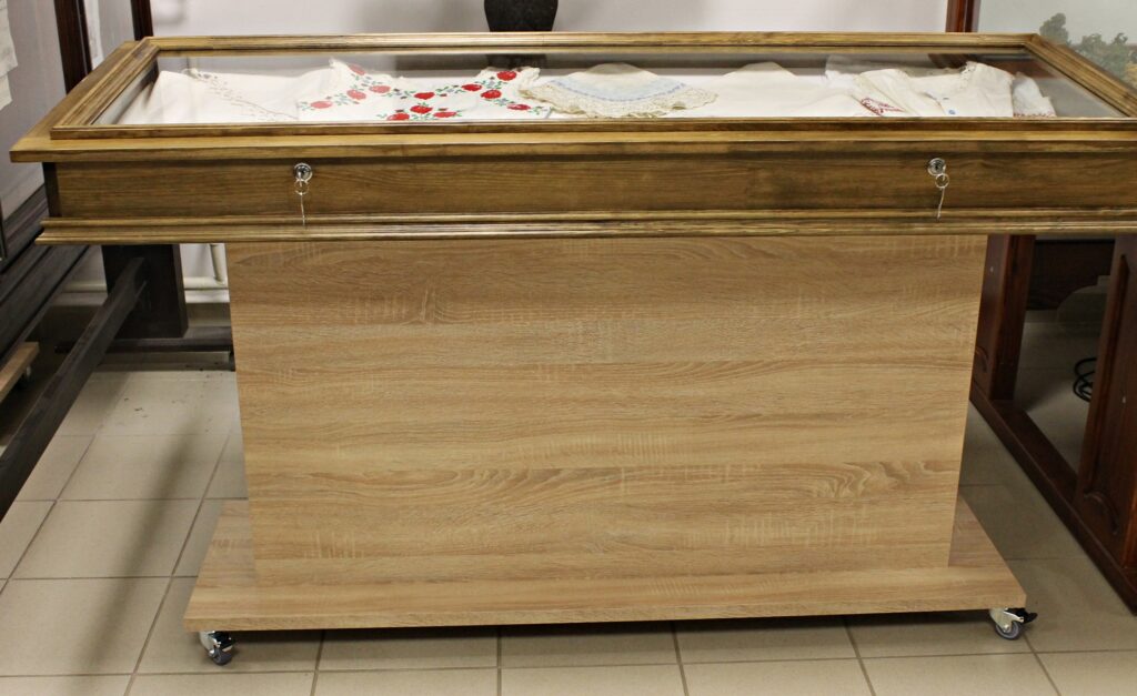 Az Isaszegi Múzeumbarátok Köre NEA pályázati pénzéből készíttetett 3 db fekvő textiltárló. Készítette Csóry Péter isaszegi asztalos.