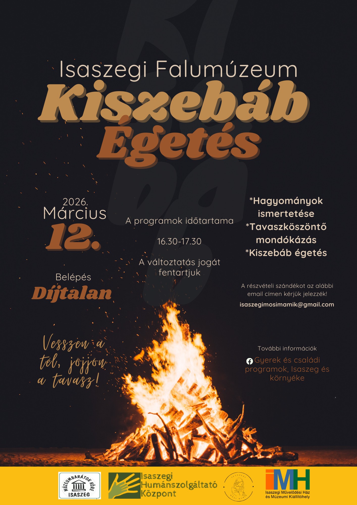 A Szervezők minden kedves érdeklődőt szeretettel várnak a múzeumkertben megrendezendő Kiszebáb égetés tavaszváró-télűző rendezvényre. Időpontja: 2026. március 12. (csütörtök) kb. 16:30 – 18:00 Örülünk, hogy a 2024. évben elkezdett elsősorban kisgyermekes Családoknak szóló hagyományőrző rendezvény folytatódik. Sok sikert kívánunk hozzá és a magunk részéről szívesen támogatjuk azt. Reméljük, hogy az időjárás is kedvezően alakul majd erre a napra. Az Isaszegi Baba – Mama Klubnak további munkájához sok sikert kívánunk!A rendezvényt az Isaszegi Múzeumbarátok Köre is támogatja.