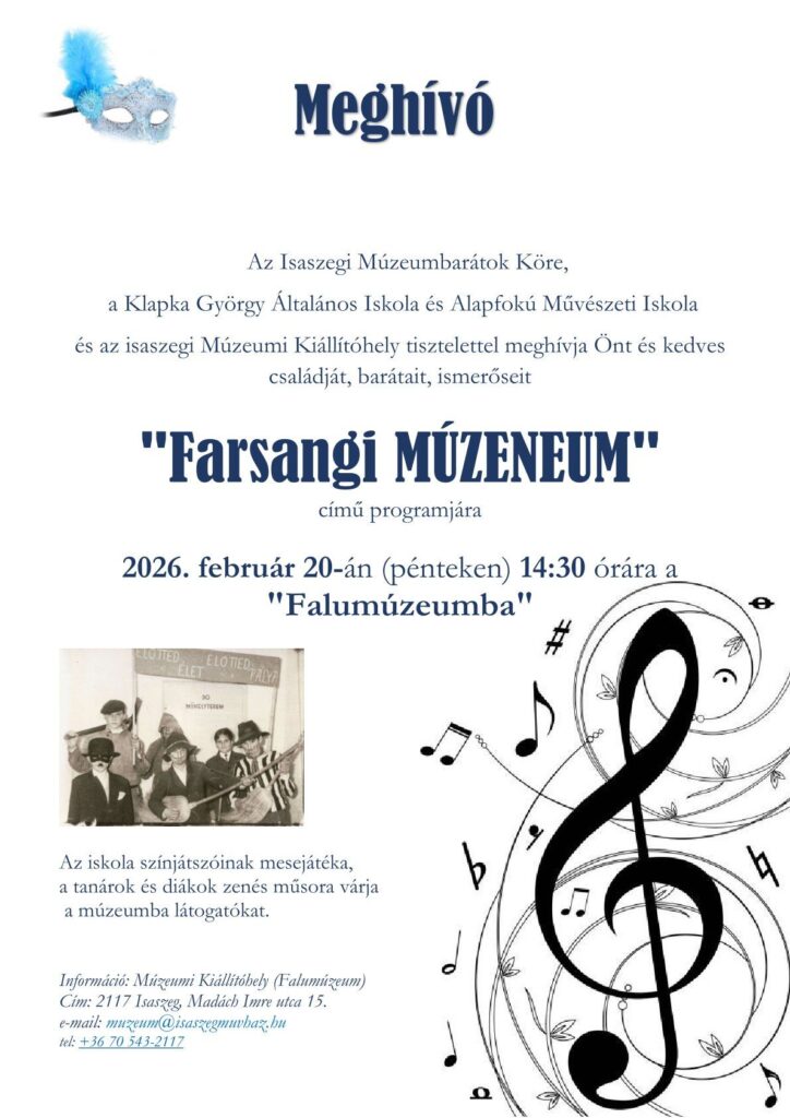 A Szervezők: az Isaszegi Múzeumbarátok Köre, a Klapka György Általános Iskola és Alapfokú Művészeti Iskola és a Múzeumi Kiállítóhely szeretettel hívja Önt és kedves Családját az első alkalommal megrendezésre kerülő farsangi „MÚZENEUM” című programjára